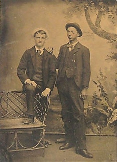 Иногда действительно мертвые на фотографии выглядят так же, как живые. И не отличишь. На этом снимке, видимо, мертв молодой человек справа, так как он стоит в более простой позе и за его спиной явно есть что-то, что его поддерживает в вертикальном положении. Так что если вы сразу поняли, что это он, — вы правы. Но если вы решили, что мертв молодой человек слева, — вы тоже правы. Позади него тоже стоит поддерживающая подставка. Да, на этой фотографии два покойника.