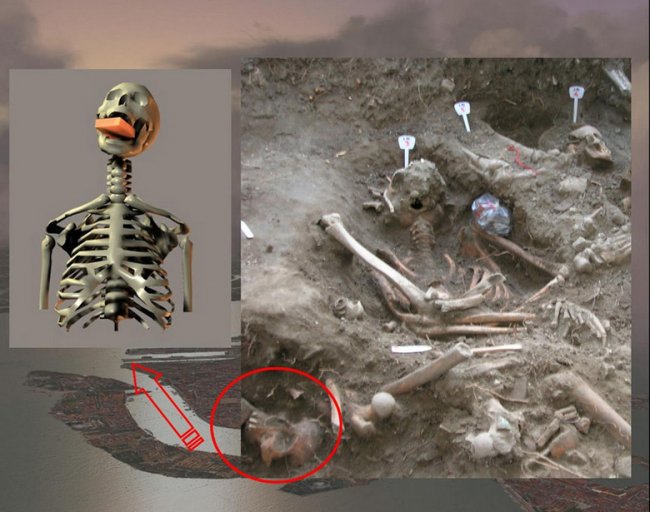 Скелет с отрубленной головой в ногах на древнем «кладбище вампиров» в польском городе Гливице