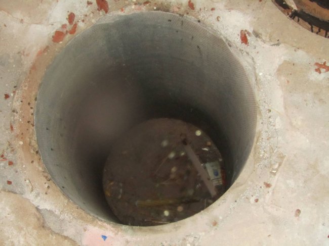 Почему-то никто эту яму не засыпал, даже когда делали переэкспозицию музея. Просто поставили на нее сверху бочку.