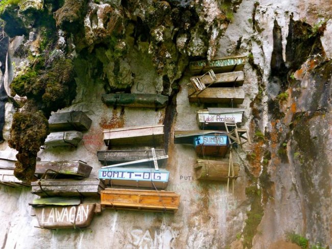 На протяжении веков, гробы с останками известных граждан небольшого горного городка Сагада на Филиппинах подвешивали вдоль скал долины Эхо. Традиция связана с верой племени Игорот, что висящие тела мертвых приближает их ближе к небесам, и в дополнение спасает их тела от животных падальщиков.