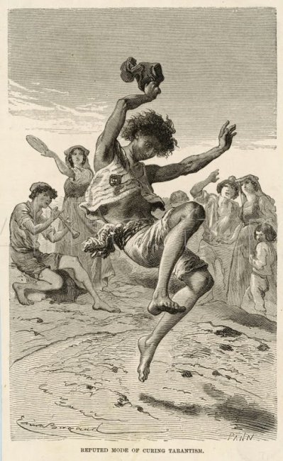 Но вот в 1785 г. врач мадридского госпиталя Мануэль Иранета-и-Хаурейи опубликовал результаты исследований действия укусов ядовитых пауков на человеческий организм. В нескольких случаях испанский медик наблюдал у укушенных (это были солдаты, находившиеся в полевом лагере) беспокойство и судорожные подергивания, но когда он спросил, не испытывают ли они желания потанцевать, пациенты приняли этот вопрос за шутку. Им было совсем не до танцев.