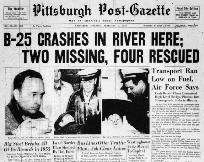 К городу самолет подлетал как в песне, «на честном слове и на одном крыле», сжигая последние капли топлива. И все же горючки не хватило. В-25 падал прямо на город. Командир принял решение сажать машину на протекающую через город реку Мононгахилу.
