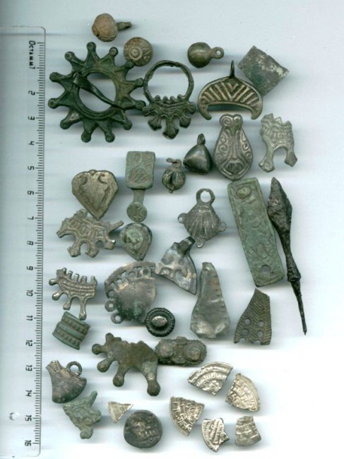 Археологические находки древних славянских оберегов. Вот что можно было найти на обычном селище вятичей. Берег реки Высса, Калужская область. Селище неоднократно горело и подвергалось разорению. Основная часть находок — времена вятичей (XI-XIII вв.). Вверху: пуговицы, радимичская запона для плаща, височное кольцо для девочки, лунница, накладки на пояс, обломки височных колец, кулонов и предметы неизвестного назначения. Кроме того, наконечник стрелы, похожий на половецкий.