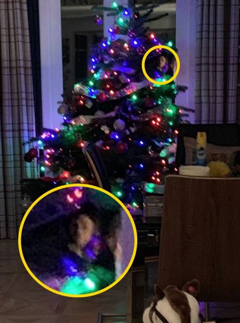 Женщина сфотографировала наряженную к Рождеству елку и не сразу заметила пугающее бледное лицо среди ветвей, словно нечто стояло у окна за елкой.