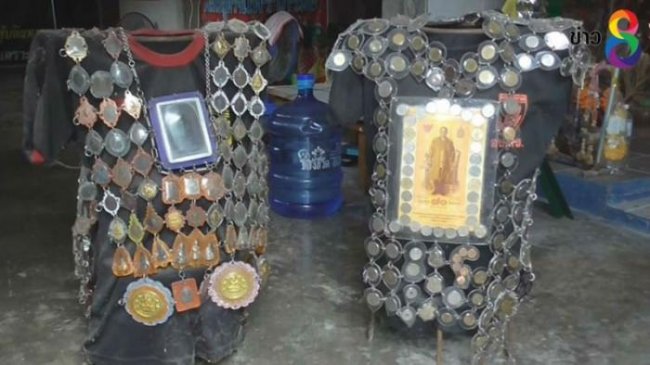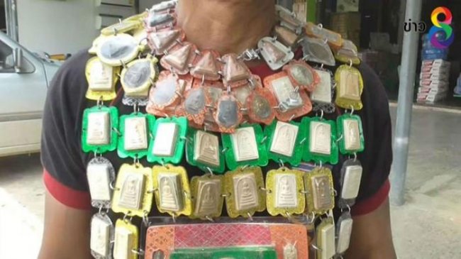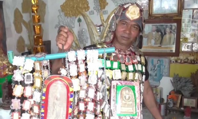 Еще два года назад на всю страну прославился мужчина по имени Саном Чантарафиром (Sanom Chantaraphirom), который создал из защитных буддийских амулетов своеобразную броню и почти постоянно носил ее на себе (paranormal-news.ru).