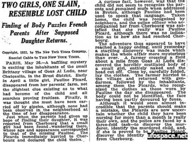 Это был апрель 1922 года, когда 2-летняя Полин Пикар играла на ферме ее родителей в местечке Goas al Ludu в провинции Бретань, Франция. И вдруг она пропала и никто из работников фермы и родителей не мог ее найти.