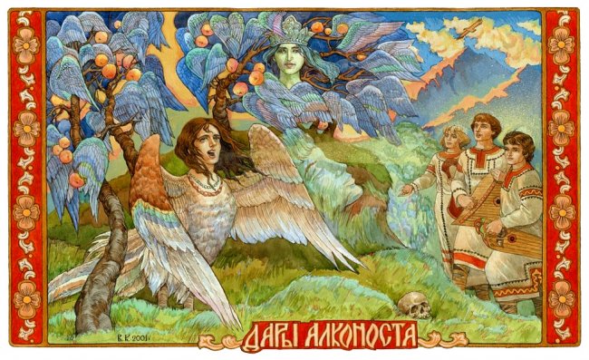 Лик у нее женский, тело же птичье, а голос сладок, как сама любовь. Услышавший пение Алконоста от восторга может забыть все на свете, но зла от нее людям нет, в отличие от ее подруги птицы Сирин. Алконост несет яйца «на крае моря», но не высиживает их, а погружает в морскую глубину. В эту пору семь дней стоит безветренная погода — пока не вылупятся птенцы.