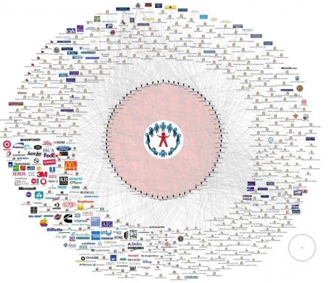 При современном уровне материализации общественного сознания, доминировании материальных ценностей, смыслом жизни индивида являются потребление и деньги, а все процессы в обществе управляются с помощью капитала. Немножко примеров по уровню глобализации мирового капитала. Итак, 10 крупнейших корпораций, а именно: Coca-Cola, Nestle, Procter&Gamble, Unilever, Kraft, Pepsico, Hellogg’s, Mars, Johnson&Johnson — формируют спрос, контролируют и производят почти всё, что мы приобретаем на рынке. А под контролем и огромным влиянием таких гигантов, как Apple, Google, Facebook, Яндекс, ВКонтакте, вся частная жизнь становится достоянием глобального процесса. Сегодня 90% медиа компаний Америки контролируются всего 5-ю субъектами. Финансовая сфера контролируется транснациональными банками, такими как BankofAmerica, JPMorganChase, CitiGroup и WellsFargo.