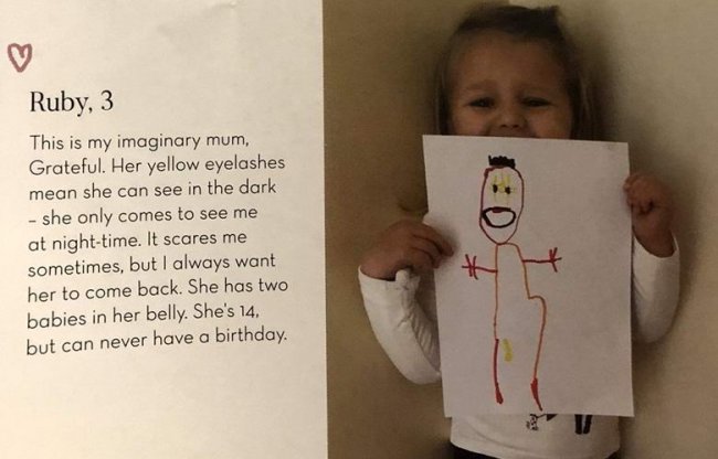 Выяснилось, что воспитательница в саду попросила детей рассказать об их воображаемых друзьях (если таковые, конечно, имеются), а также нарисовать этих персонажей. Затем малышей сфотографировали с их рисунками и добавили к снимкам описания вымышленных приятелей, чтобы мальчики и девочки могли продемонстрировать это родителям. Тем не менее, отец и мать Руби почувствовали отнюдь не умиление, взглянув на художество и цитату дочери. Вот что там было написано: