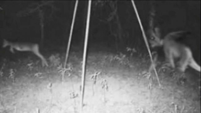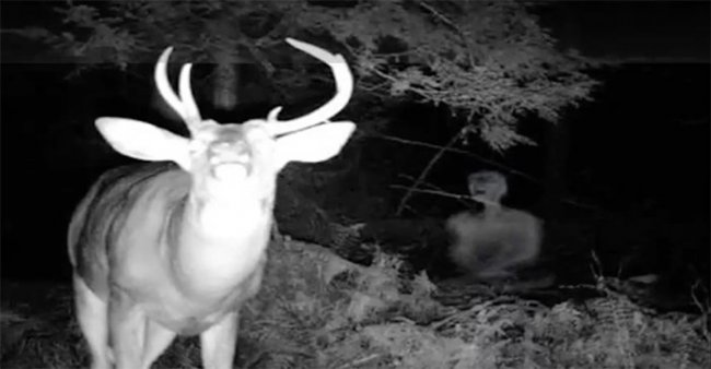 Приглядитесь. За оленем следует какая-то темная, пугающая уже одним своим силуэтом фигура. Возможно, камера запечатлела момент охоты не известного науке создания на бедное животное.