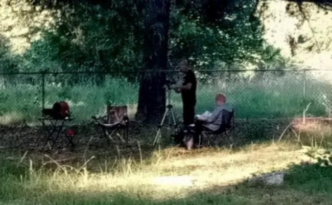 Но это это такое там выглядывает из-за ближайшего к нам дерева? Белка? Нет, при увеличении хорошо видна голова ребенка, скорее всего девочки.