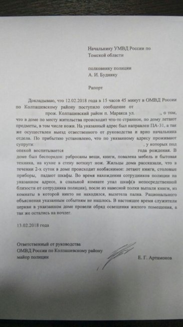 Священнослужитель из Колпашевской епархии приехал к этой семье, побеседовал с ребёнком, с родителями, помолился. Он также был свидетелем всех тех вещей, которые описаны в рапорте. По приезду священника так называемый «полтергейст» немного утих, но потом эти явления продолжились вновь.