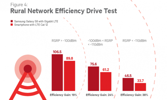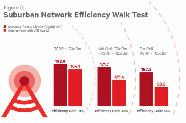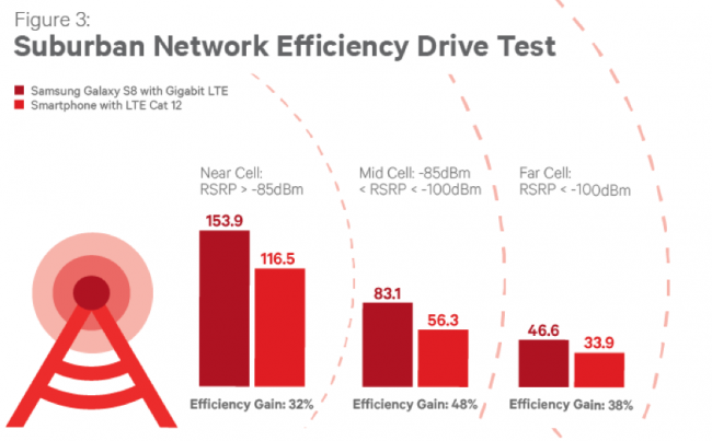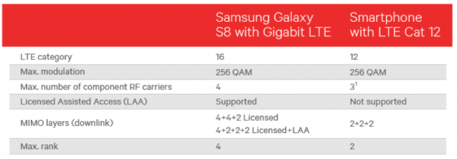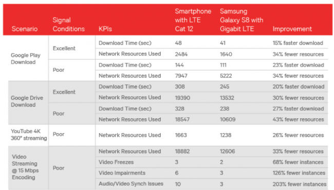 В нижеприведенной таблице можно увидеть более высокую производительность и лучший пользовательский опыт в случае с Galaxy S8, поддерживающим гигабитный LTE, по сравнению со смартфоном 12-й категории в сети, поддерживающей 4x4 MIMO на одной несущей частоте LTE с модуляцией 256-QAM для достижения максимальной скорости загрузки 400 Мбит/с. Именно поэтому, несмотря на то что это сеть LTE не гигабитная, устройство с поддержкой гигабитного LTE способно обеспечить более высокую производительность, чем смартфон 12-й категории: