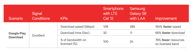 Загрузка из Google Play была протестирована путем сравнения Galaxy S8 со смартфонами 12-й категории на малой соте с использованием технологии LAA в полосе 20 МГц лицензируемого спектра, а также трёх несущих нелицензируемого спектра по 20 МГц каждая. Таким образом, в общей сложности было использовано 80 МГц спектра.