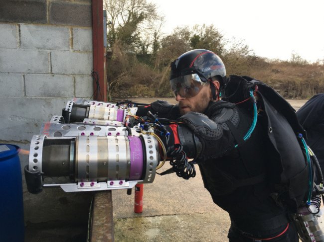 Рабочая модель состоит из шести реактивных двигателей, прикрепляемых к рукам и ногам, и топливного бака на спине. При первом удачном запуске изобретатель пробыл в воздухе на высоте полуметра несколько секунд. С каждым усовершенствованием экзоскелета этот промежуток времени увеличивается.