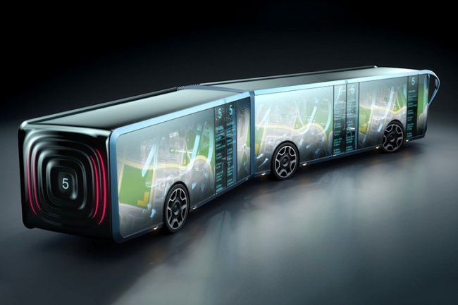 Концепт городского автобуса, внешние панели которого отображают интерактивную карту с маршрутом движения