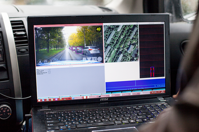 Испытания Nissan X-Trail c беспилотной системой в режиме эмуляции. На экране ноутбука отображается, как автомобиль «видит» окружающую среду.