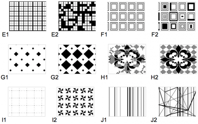 На этом этапе участникам показывали не различные категории узоров, а скорее широкую выборку. Их намеренно сделали черно-белыми, поскольку цвета могли бы испортить результаты. Вот узоры: