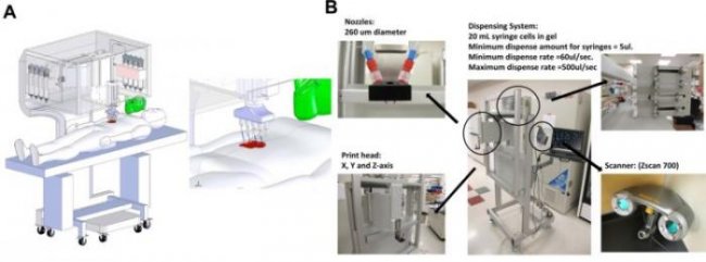 Сообщается, что оно имеет достаточно компактные размеры, чтобы его можно было перемещать между больничными палатами. Его легко можно поставить рядом с кроватью, чтобы любой пациент мог спокойно лежать, пока принтер выполняет свою работу. Он оснащен специальными насадками, которые и наносят «биологические чернила» на раненную плоть.