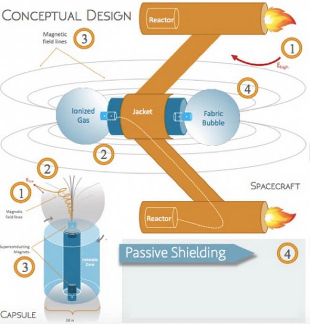 Магниты не будут отклонять гамма-лучи. Но они могут заставить заряженные альфа-частицы — еще один компонент космических лучей, которые при облучении космического корабля создадут рентгеновские лучи. Они начнут двигаться к концам космического корабля, который будет закрыт двумя «куполами» материала, заполненными смесью ионизированного газа, который имитирует ионосферу Земли.