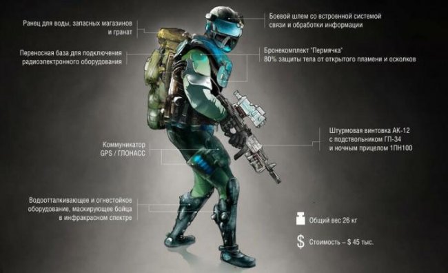 Первое, на что я сразу обратил внимание — это то, что в экипировке планируется применение экзоскелета — механической конструкции из титана, которая будет значительно облегчать подъем и перенос тяжестей, длительное нахождение в одном положении, бег по пересеченной местности и другие действия, тяжелые для нашего тела. Также упоминается внедрение противоминных ботинок и противотепловых элементов костюма, не позволяющим радиолокационным системам и инфракрасным датчикам противника обнаружить солдата. И это, кстати, не все о маскировке — в системе «Сотник» будет внедрен комплекс маскировки «Хамелеон», адаптирующий цвет костюм к цвету среды, в которой он находится. Более того, он даже может имитировать поведение этой самой среды, например, притворившись листвой, которая колышется из-за ветра. Разработка «Росэлектроники». Неплохо, да?