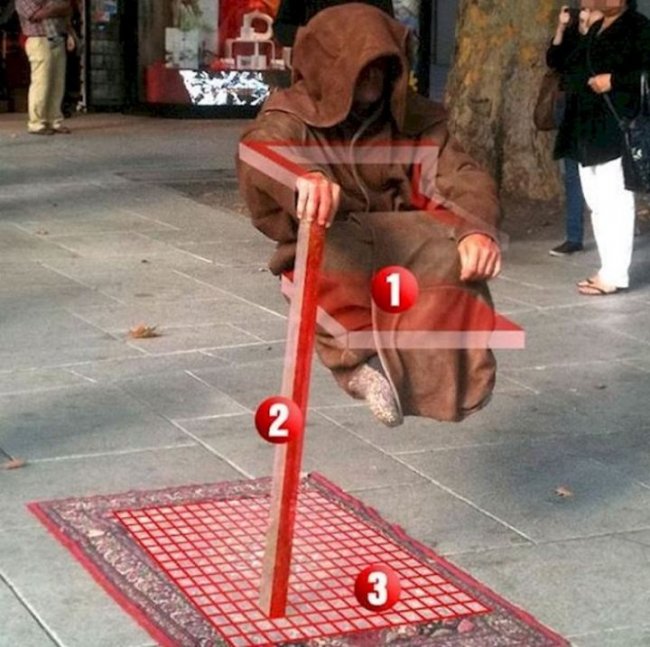 Обычно под фокусником находится коврик. А сам человек одет в свободные длинные одежды. Такой антураж соблюдается не с проста. Как правило, артист парит в воздухе, положив руку на вертикальную палку. Создается впечатление, что он завис в воздухе только за счет нее, преодолевая силу тяжести.
