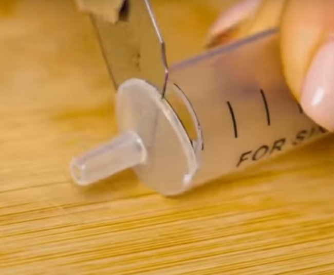 Покупать устройства для удаления косточек из вишни, яблок и слив накладно. Аксессуары требуются редко, а места занимают много. Берите в руки обычный одноразовый шприц. У шприца надо отрезать ту часть, куда вставляется игла.
