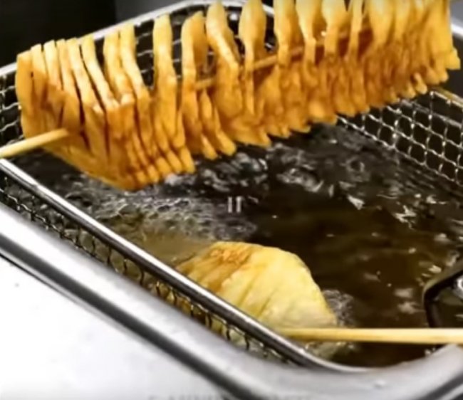 Вкусная картошка фри – отличный гарнир и самостоятельное блюдо. А если проткнуть очищенный клубень длинной шпажкой и нарезать картофелину по спирали, получается «спиралька-фри». Жарить во фритюре можно прямо на шпажке.