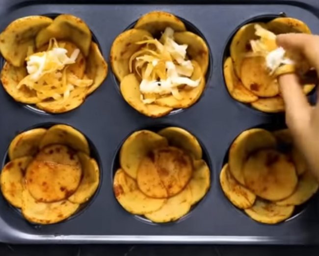 Даже если чипсы не получились, не беда. Толстенькие ломтики картошки укладывают в силиконовые формы для кексов, наполняют «корзинки» беконом и тертым сыром. Теперь осталось все убрать в духовку на 10 минут (+200 С), вкуснятина готова.