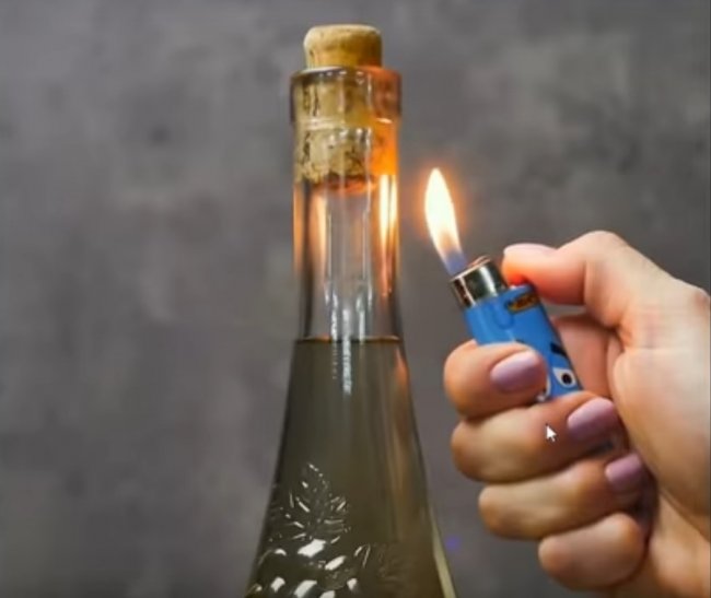 Пробку из бутылки вина можно достать без применения штопора и предметов, его напоминающих. Лайфхак настолько хорош, что на него можно спорить. Чтобы вынуть пробку, нагревайте горлышко бутылки зажигалкой. В процессе нагрева пробка буквально вылетит из горлышка. Второй вариант – прогреть горлышко бутылки горелкой, но делать это тоже следует очень аккуратно.