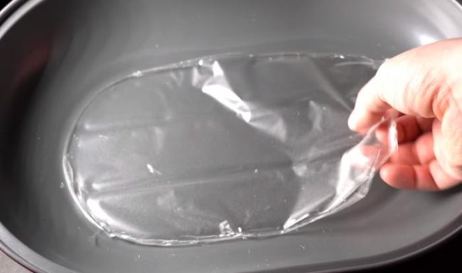 Чтобы получить из него пленку, вроде той, что упаковывают продукты в магазине, толщиной 2 мкрн, горячий состав нужно равномерно распределить по противню. Толщина первоначально слоя не должна превышать 3 мм.