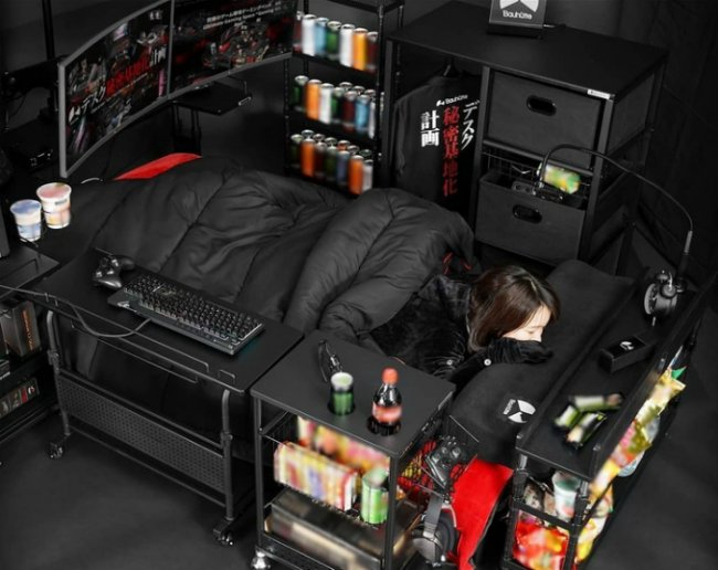 Многие японцы сходят с ума от видеоигр. Именно для них была придумана необычная многофункциональная кровать. Спальное место имеет подъемные спинки, а по периметру стоят мониторы, клавиатуры, игровые джойстики и холодильники с напитками.