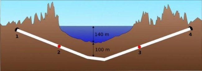 Это железнодорожный тоннель Тоннель Сэйкан в Японии длиной 53,85 км. Тоннель опускается на глубину около 240 метров, на 100 метров ниже уровня морского дна Это самый глубоко залегающий под морским дном и второй по длине (после Готардского базисного тоннеля) железнодорожный тоннель в мире.
