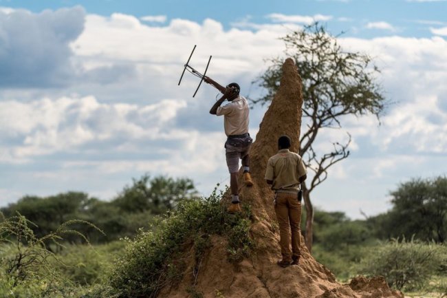 Писка все не было, и наш рейнджер с помощником вышли из машины и залезли на термитник, чтобы быть повыше. При этом они водили антенной из стороны в сторону, периодически прокручивая ее в руке вокруг своей оси.