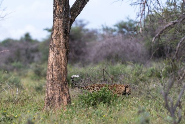 Мы искали в лесу леопарда. Делали это очень странным образом. Рейнджер поднимал над головой антенну, похожую на телевизионную, и слушал писк своего леопардофайндера. Писка не было, и мы ехали дальше. Не по дорожкам, а просто напролом через лес, подминая кусты.