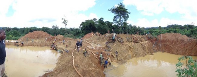 Так выглядит общий план карьера. В левом карьере трудятся в основном женщины, а в правом мужчины. Мужчины выполняют более тяжелую работу — накидывают золотоносные пески на прибор, который подключен к водяной попме.