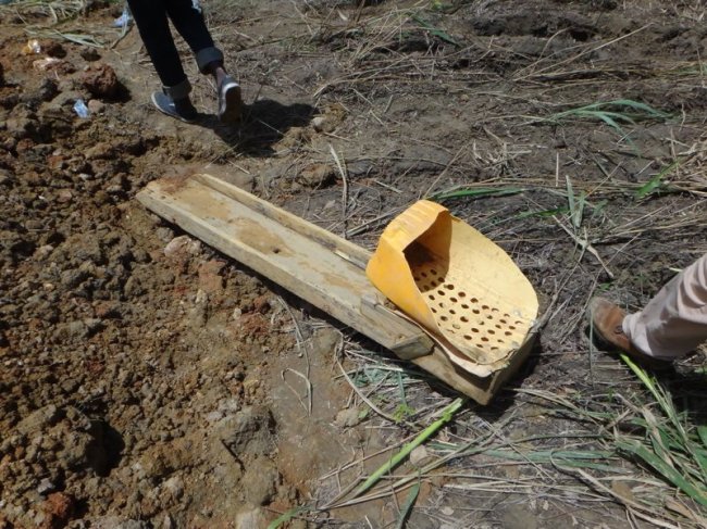 От крупных камней грунт отделяется при помощи вот такого высокотехнологичного прибора. Любопытно, что по всей стране я везде видел одинаковую конструкцию этой промывашки. Видимо один человек (предполагаю что скорее всего белый) за неимением лучших материалов под рукой на коленке сконструировал нечто подобное, а затем африканцы стали бездумно копировать эту конструкцию, словно китайцы машины и технику. И да железные приборы для промывки золота они тоже копируют и не стремятся улучшить ни разу.