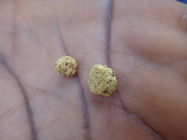 Когда концентрат промыт на приборе и доведен на лотке старательными руками черных женщин, золото отделяют при помощи ртути. Ртуть слипает частички золота, затем ее выпаривают на огне, а остаётся только золото в форме вот таких шариков. Они увесистее свинца. В таком виде он продается перекупам. Не думаю что они аффинируют его в своих условиях или выплавляют слитки.