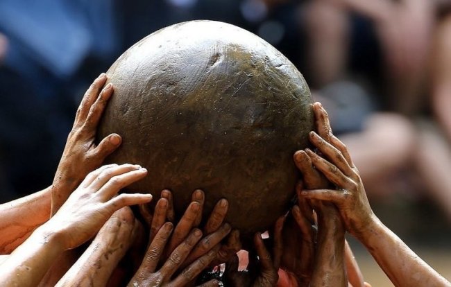 Во время игры участников подбадривает беспрерывный быстрый стук барабана. На зрителей с арены летят брызги, и скоро они тоже оказываются покрытыми грязью, но это ровным счетом никого не беспокоит.