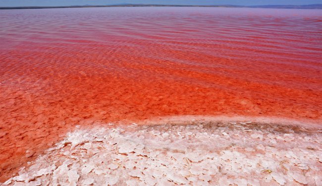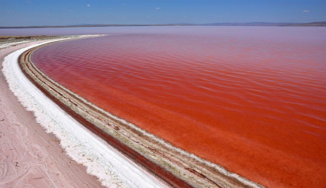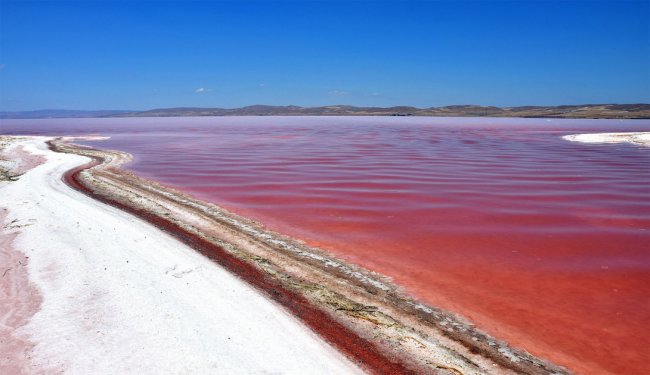 Озеро Туз находится неподалеку от городка Аксарай, что в центральной Турции. С размерами, превышающими 1500 км?, оно считается вторым по величине озером страны и одним из крупнейших в мире гиперсоленым водоемом. Озеро питают два крупных ручья, но летом, когда солнце превращает всю округу в настоящий филиал преисподней, Туз теряет и большую часть своей воды. В это же время, примерно к середине июля, начинают цвести водоросли семейства Dunaliella salinas. Они окрашивают весь водоем насыщенным, кроваво-красным цветом — смотрите сами, насколько необычно все это выглядит.