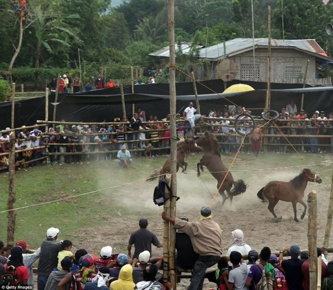 В современном мире, кажется и так хватает жестокости. Но на Филиппинах такие бои являются настоящим зрелищем, к ним готовятся и ждут. На такие бои берут детей, и надевают лучшую одежду, только ради того, чтобы увидеть как два жеребца пытаются покалечить друг друга.
