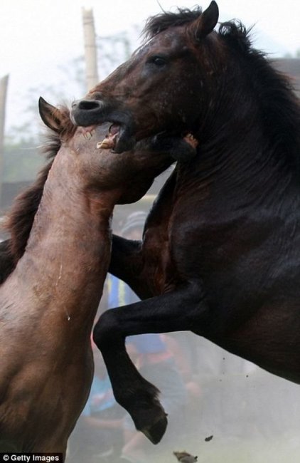 Как заставить двух жеребцов драться? Рядом с ними привязывают кобылку, за которую как раз таки и начинают сражаться жеребцы. В природе они не убивают друг друга, более слабый просто отступает. Но на арене они бьются насмерть.