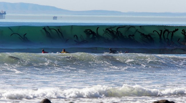 По счастью, волна скрывает от серферов лишь водоросли. Предупреждает, наверное.