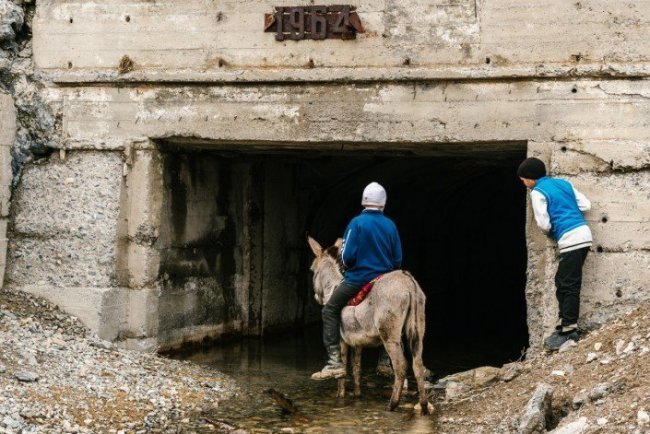 В сопровождении сельской ребятни и уже знакомого нам мальчугана на ослике Бахыт показывает нам вход в одну из заброшенных шахт.