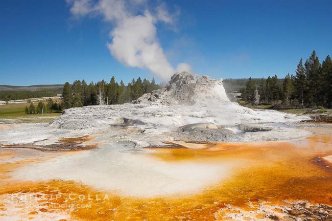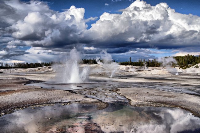 Гейзерные бассейны Йеллоустонского национального парка, безусловно, самые грандиозные из всех гейзерных полей земного шара, хотя подобные фонтанирующие горячие источники встречаются также на Камчатке, в Исландии и Новой Зеландии.