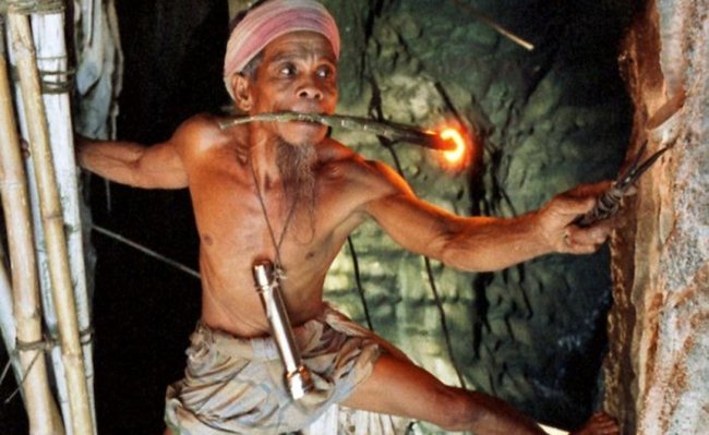 Поэтому в пещеры, которые по праву считаются чуть ли не самым неприятным на Земле местом, постоянно приезжают сезонные рабочие. Они вынуждены, за весьма небольшую плату, трудиться в совершенно кошмарных условиях, срезая птичьи гнезда в антураже, напоминающем полотна Борхеса.
