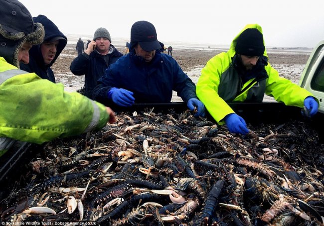 Все эти существа быстро погибли. Рыбакам удалось спасти лишь небольшую часть омаров. Они вытаскивали из с пляжа и бросали в воду.
