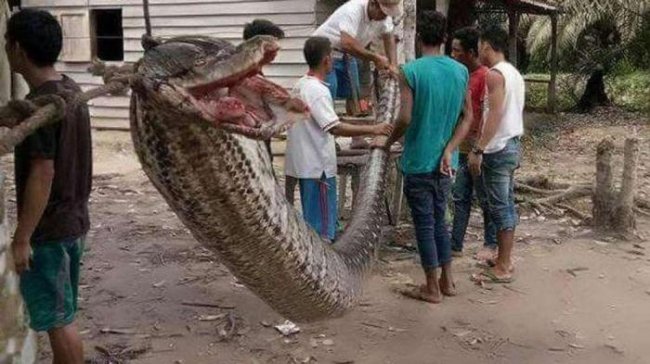 Убитый питон достигал в длину семи метров. Кстати, в Индонезии мясо этих змей считается деликатесом.