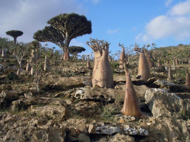 Находящийся на Аденском заливе Йемена, остров Сокотра является домом для более чем 800 редких видов растений, треть которых не растет больше нигде в мире. Некоторые из этих растений действительно выглядят словно с других планет. Их странные формы демонстрируют, как растения приспособились к тропическому пустынному климату острова.