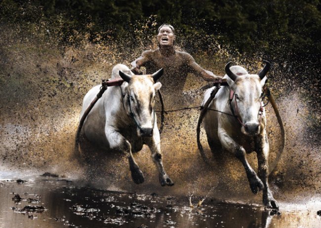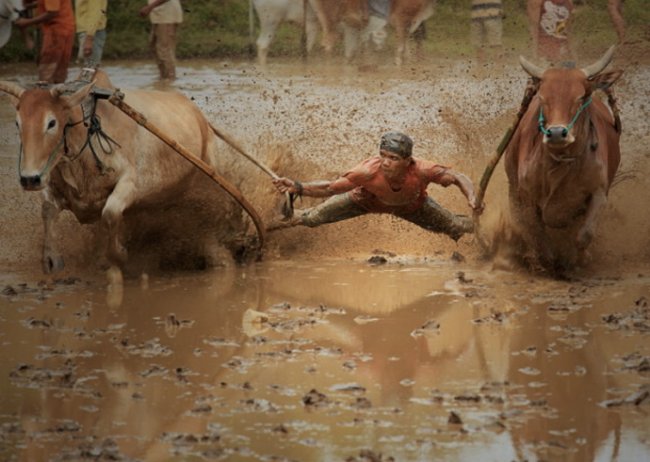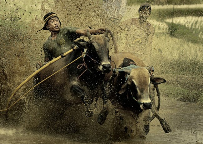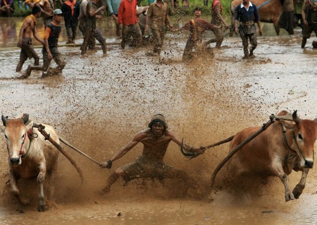 Неотъемлемыми атрибутами соревнований являются ошметки грязи, коровьи лепешки и «душ» из темной жижи с рисового поля.